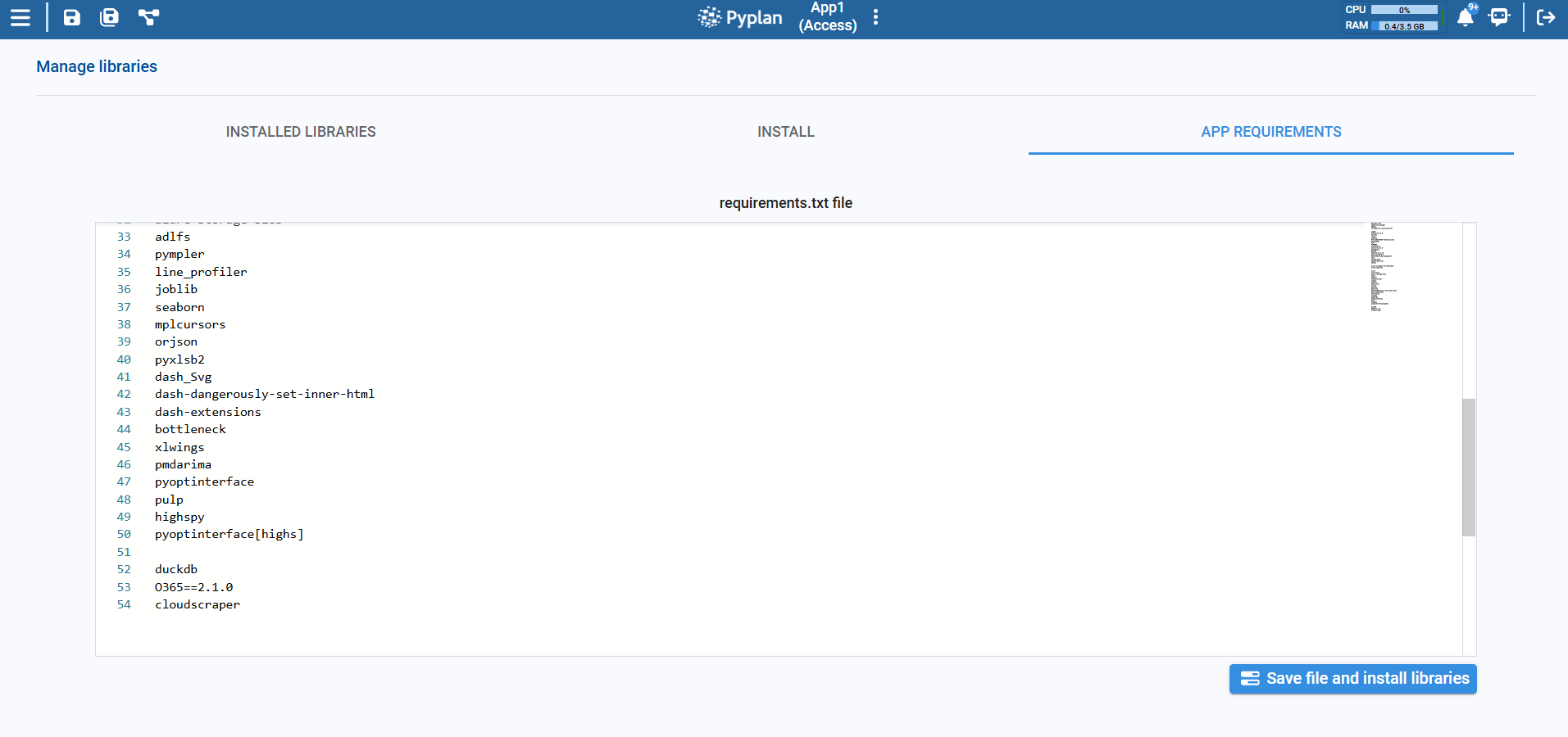 The Installed libraries tab lets us review what is currently installed and remove packages using the trash icon. When we add or remove packages through the UI, Pyplan updates requirements.txt automatically so it always reflects the libraries required by the application.