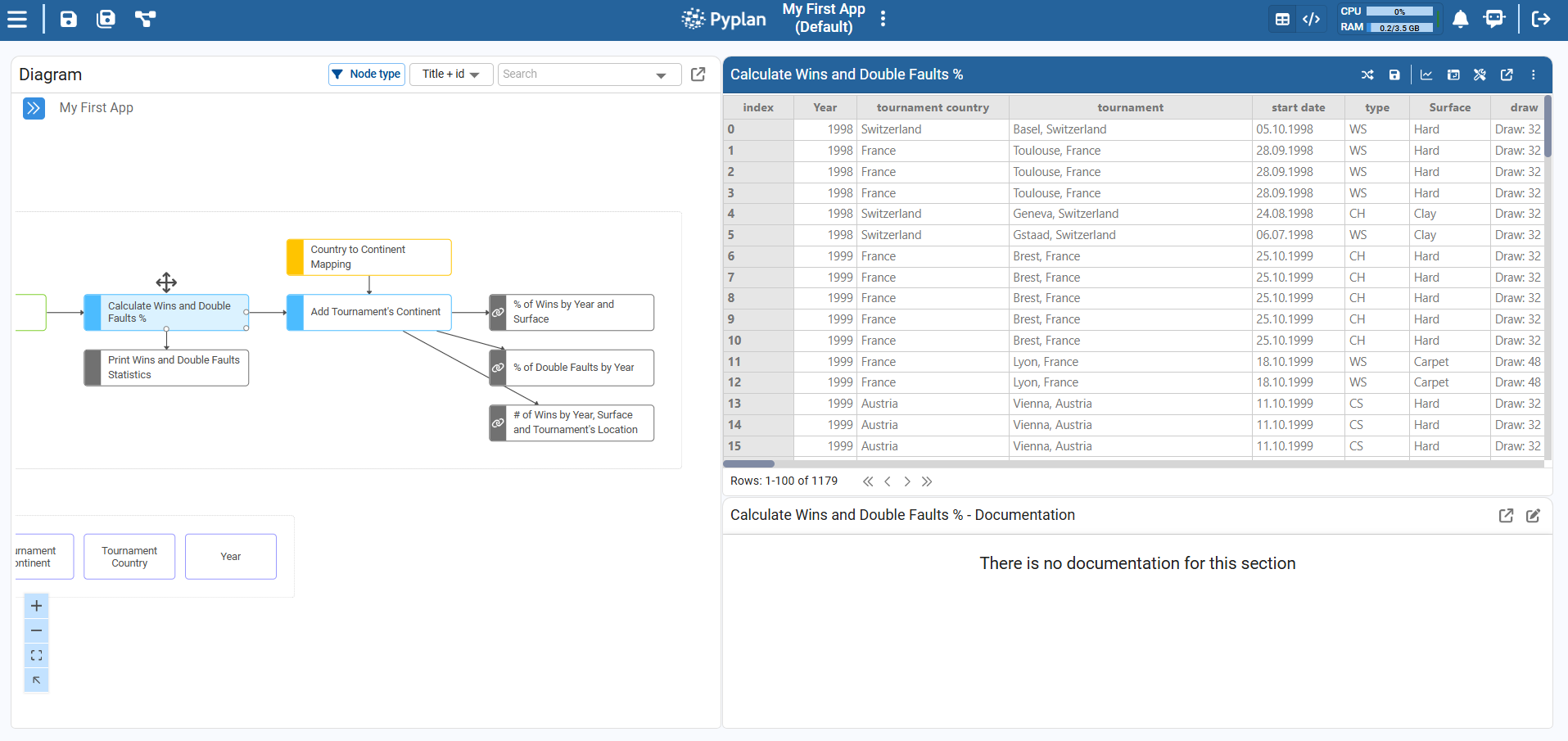 Visual representation of the application logic. Each node corresponds to a step in the data flow (loading, transformation, calculation, output), and the arrows show dependencies between nodes. From here we can select nodes, open their coding window, and run them.