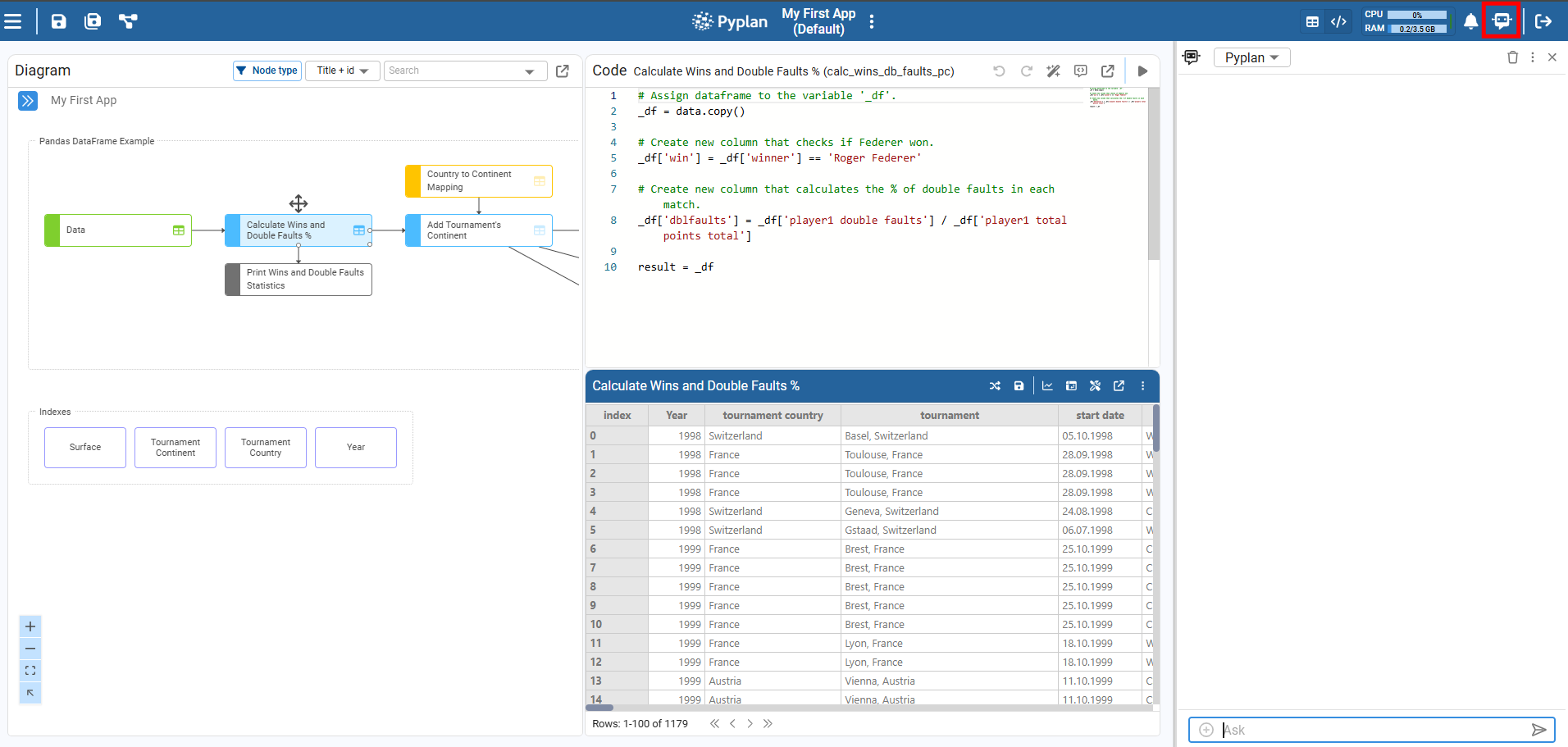 Assistant that interprets natural language questions about Pyplan. We can ask how to use features, shortcuts, or best practices directly from the modeling environment, without leaving the app.