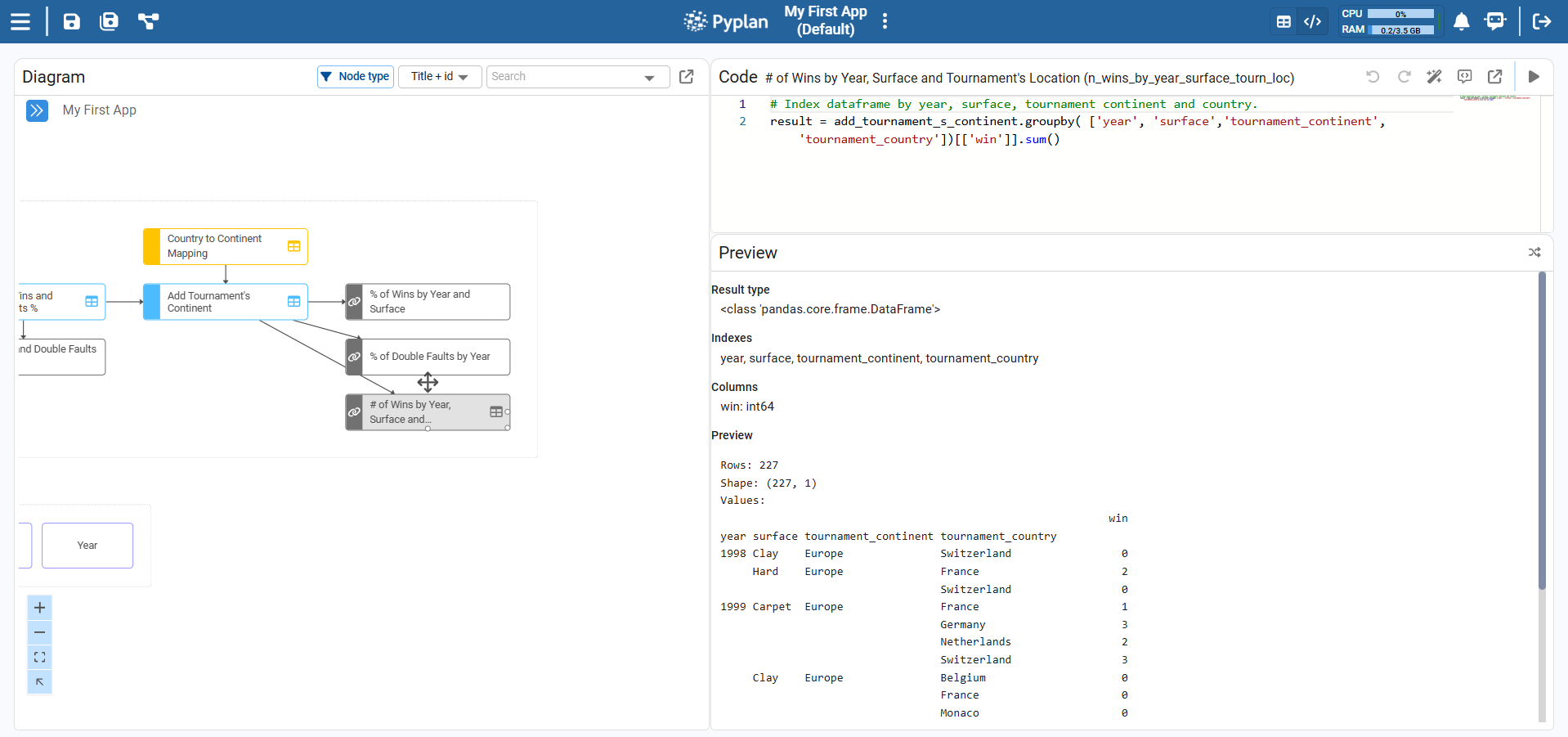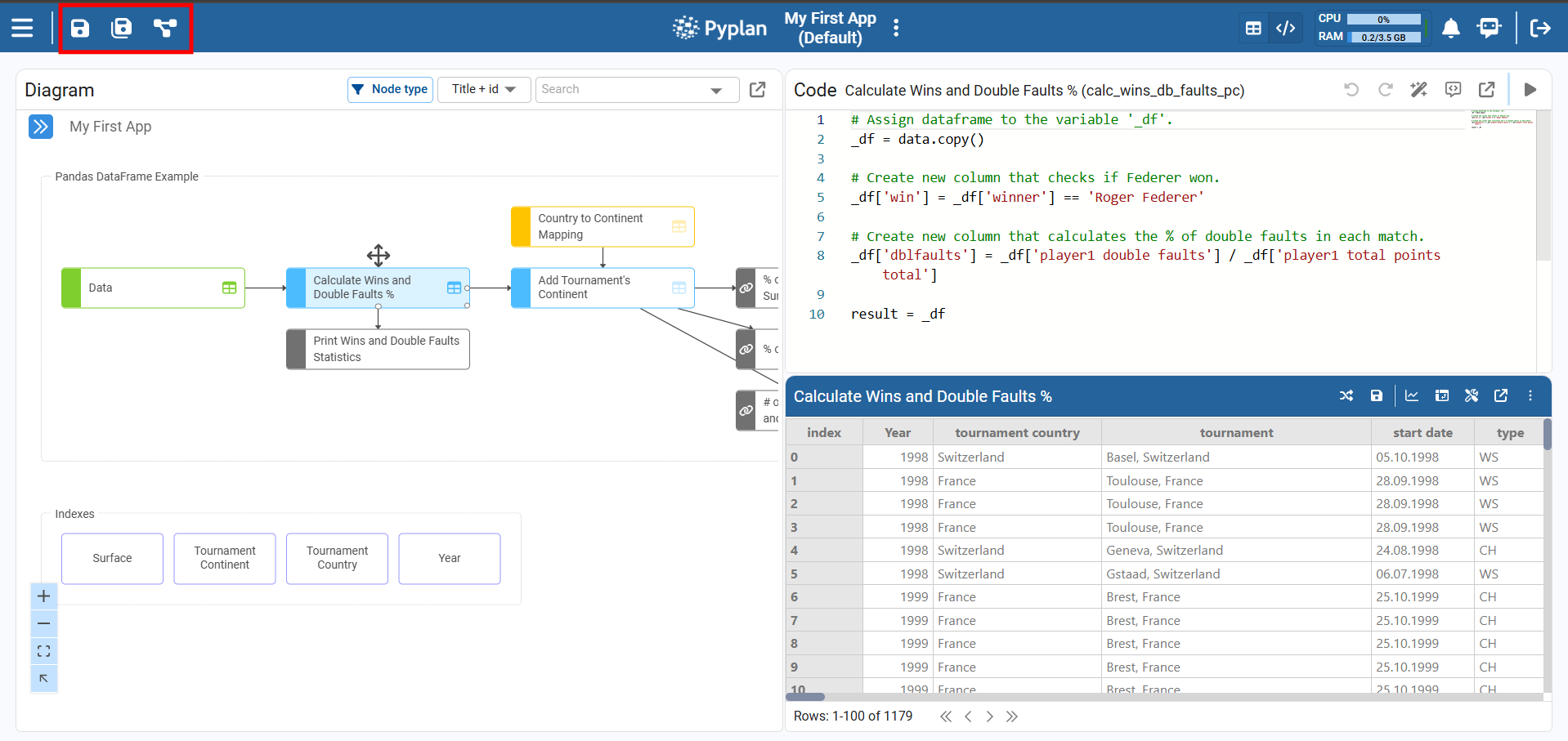 result, for example:result = _dfPyplan evaluates this code when we run the node and stores the value of result as the node’s output.