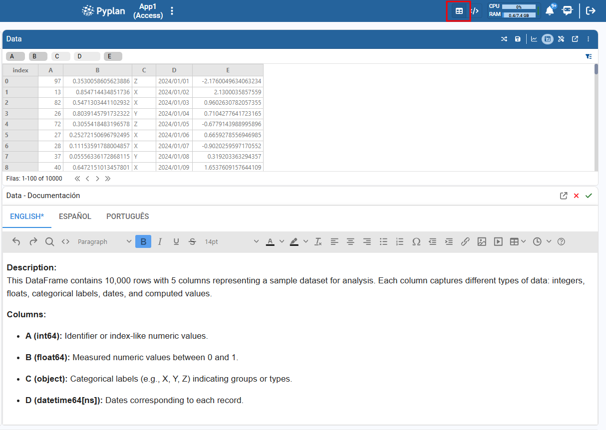 When the result is a type understood by Pyplan (for example, a pandas DataFrame, a NumPy array, or an xarray object with dimensions), Pyplan can display it: