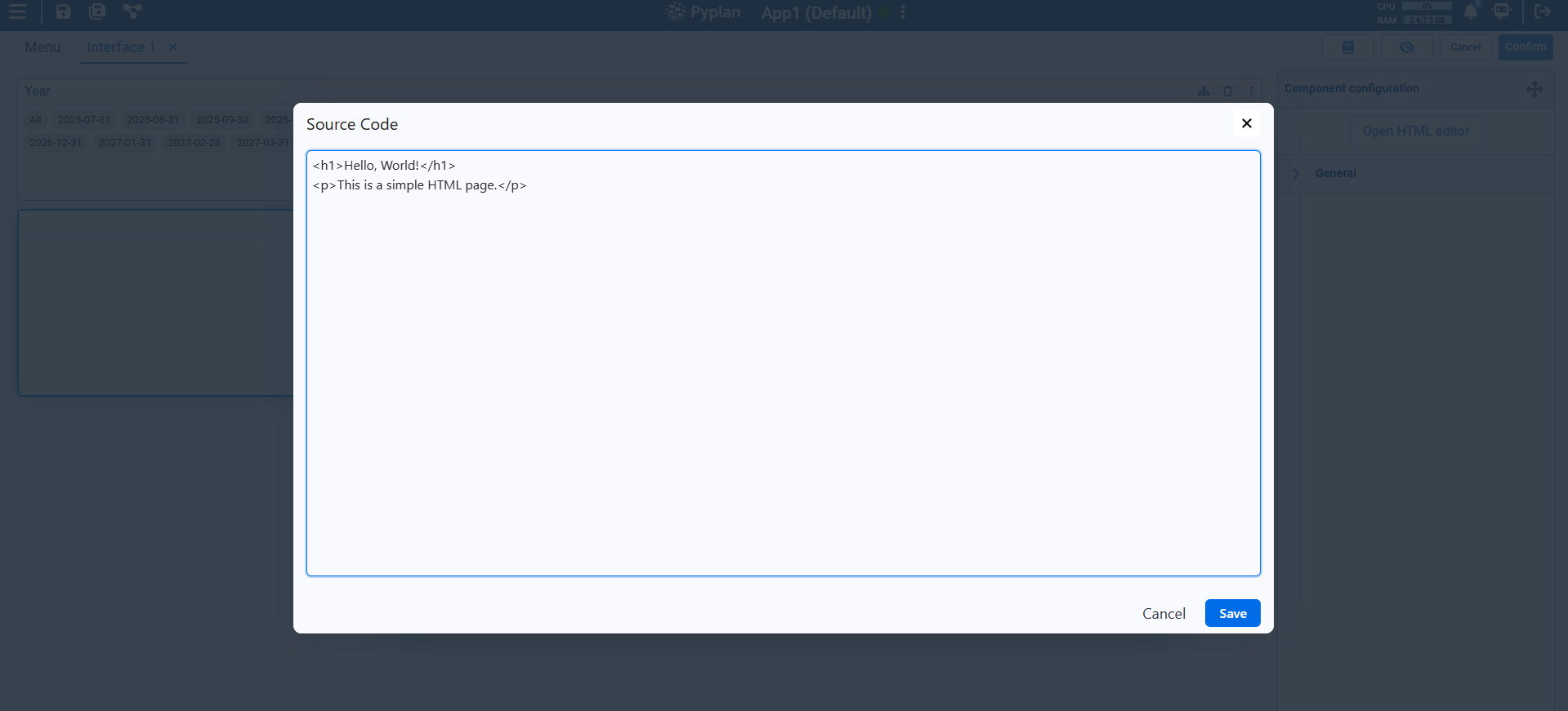 The HTML component in Pyplan allows users to insert formatted content—such as text, images, links, and styling—into their dashboards or interfaces using HTML. It’s especially useful for adding titles, descriptions, instructions, or branding elements.