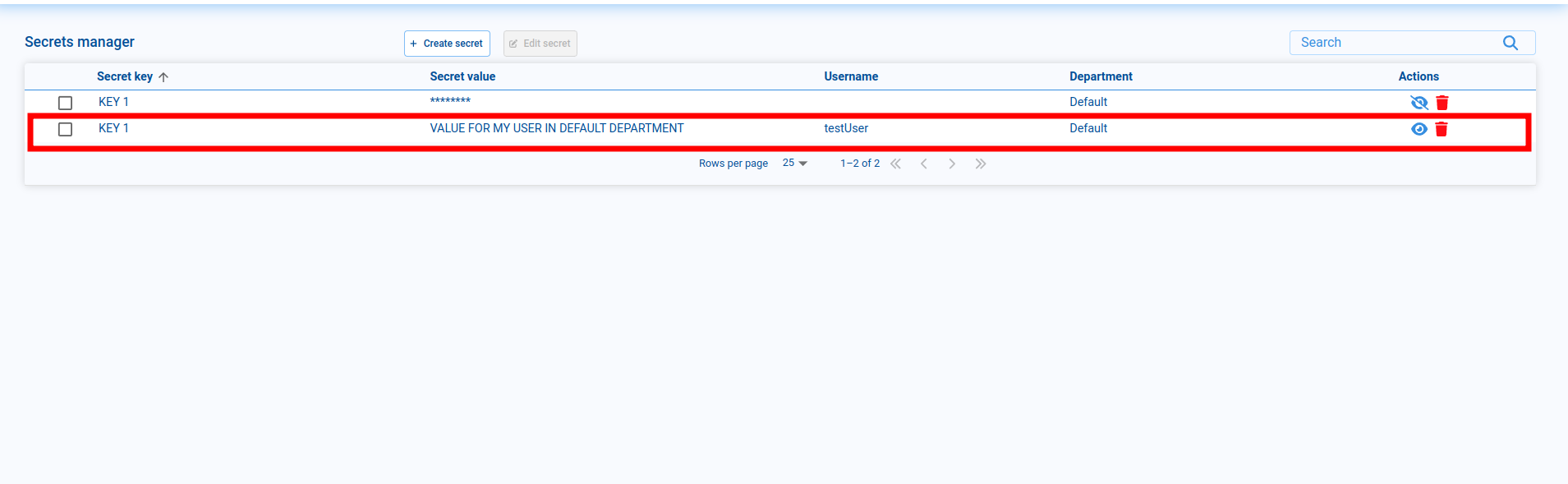 When creating secrets, it's important to note that the same secret key can be used with different department or user configurations.